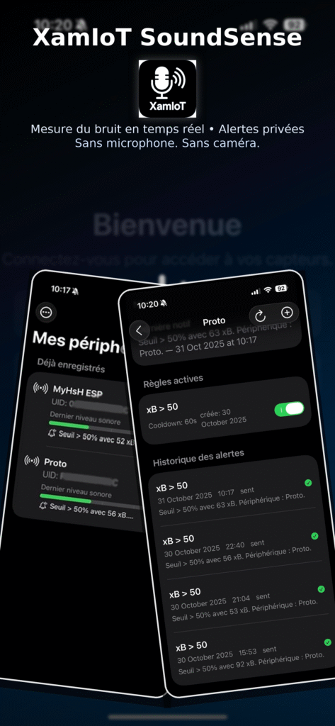 Mesure du bruit en temps réel et alertes privées, sans microphone ni caméra. Uniquement une mesure objective du niveau sonore (indice interne xB de 0 à 100). ⚠️ Pré-requis : l’usage de l’app nécessite l’achat/possession d’un périphérique XamIoT SoundSense, connecté à Internet via Wi-Fi 2.4 GHz. Sans appareil, l’app est inopérante. À ce jour l’app est gratuite (pas d’abonnement), mais elle peut évoluer vers une offre payante. Pourquoi XamIoT ?100 % centré sur le bruit : pas de caméra, pas d’enregistrement audio. Respect de la vie privée : aucune conversation n’est captée ni stockée. Actionnable : seuils personnalisés, alertes push, historique clair. Simple à déployer : capteur Wi-Fi 2.4 GHz, app iOS, notifications.